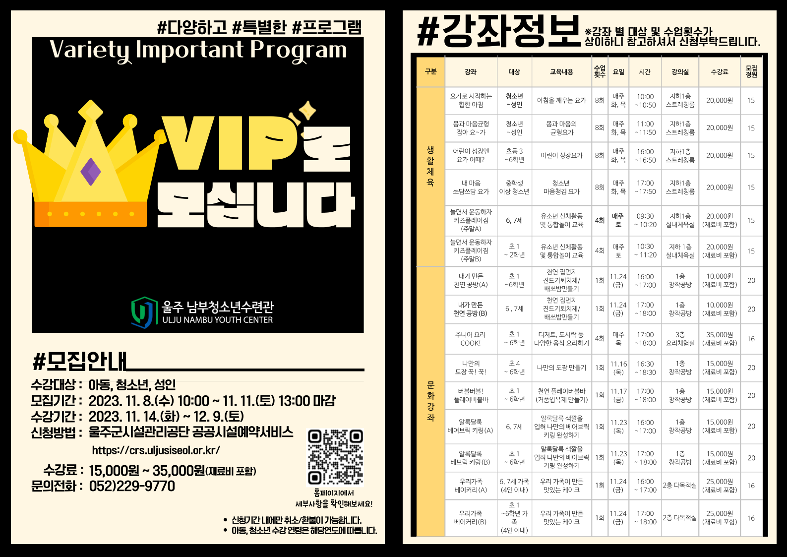 울주 남부청소년수련관에서 준비한 더! 특별한 VIP 강좌 수강생을 아래와 같이 모집합니다!