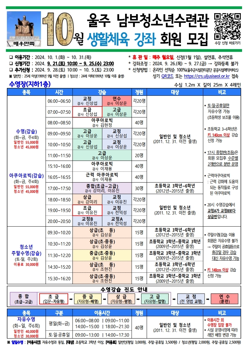 [울주남부청소년수련관 2024년 10월 생활체육 강좌 회원 모집]