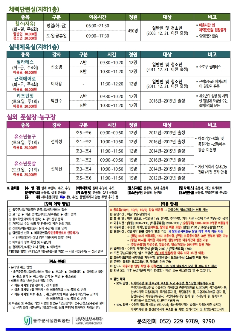 [울주남부청소년수련관 2024년 10월 생활체육 강좌 회원 모집]