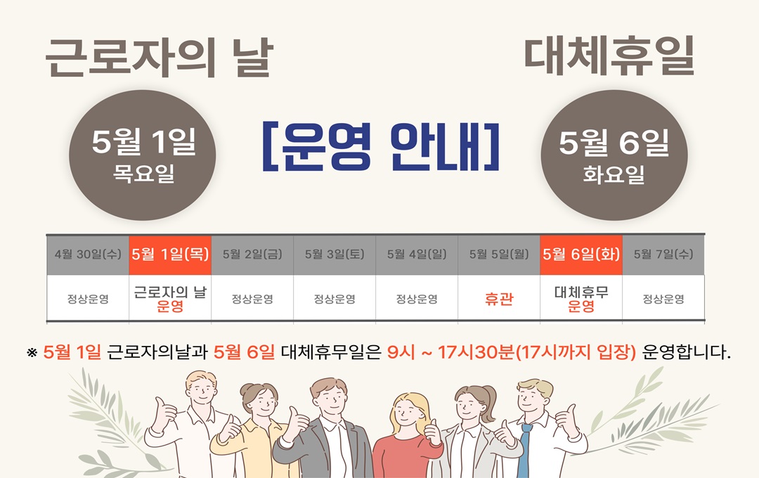 남부청소년수련관 휴일 이용 안내 5.1.(목) 근로자의날과 5.6.(화) 대체공휴일에 따른 수련관 운영 시간을 안내드립니다? ※ 운영시간: 9:00~18:00까지 / 17:00 입장 마감 / 17:30까지 이용가능(수영장, 헬스 등) 이 점 참고하시어 이용에 불편 없으시길 바랍니다? 감사합니다^^