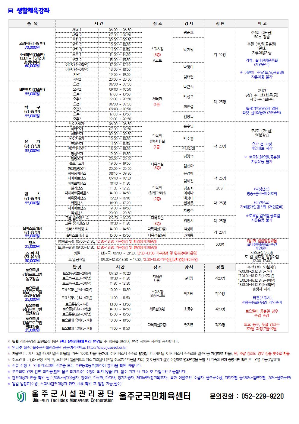 (스쿼시, 배드민턴, 탁구, 요가, 댄스, GX, 실버스트레칭, 헬스)