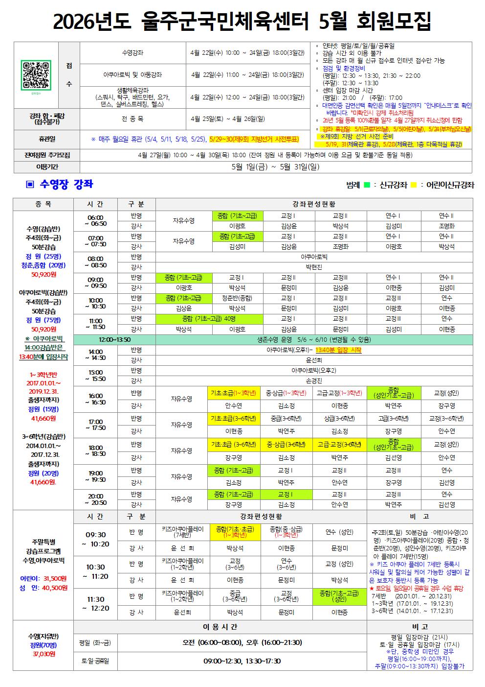[울주군국민체육센터] 2026년 5월 강좌 회원모집 안내