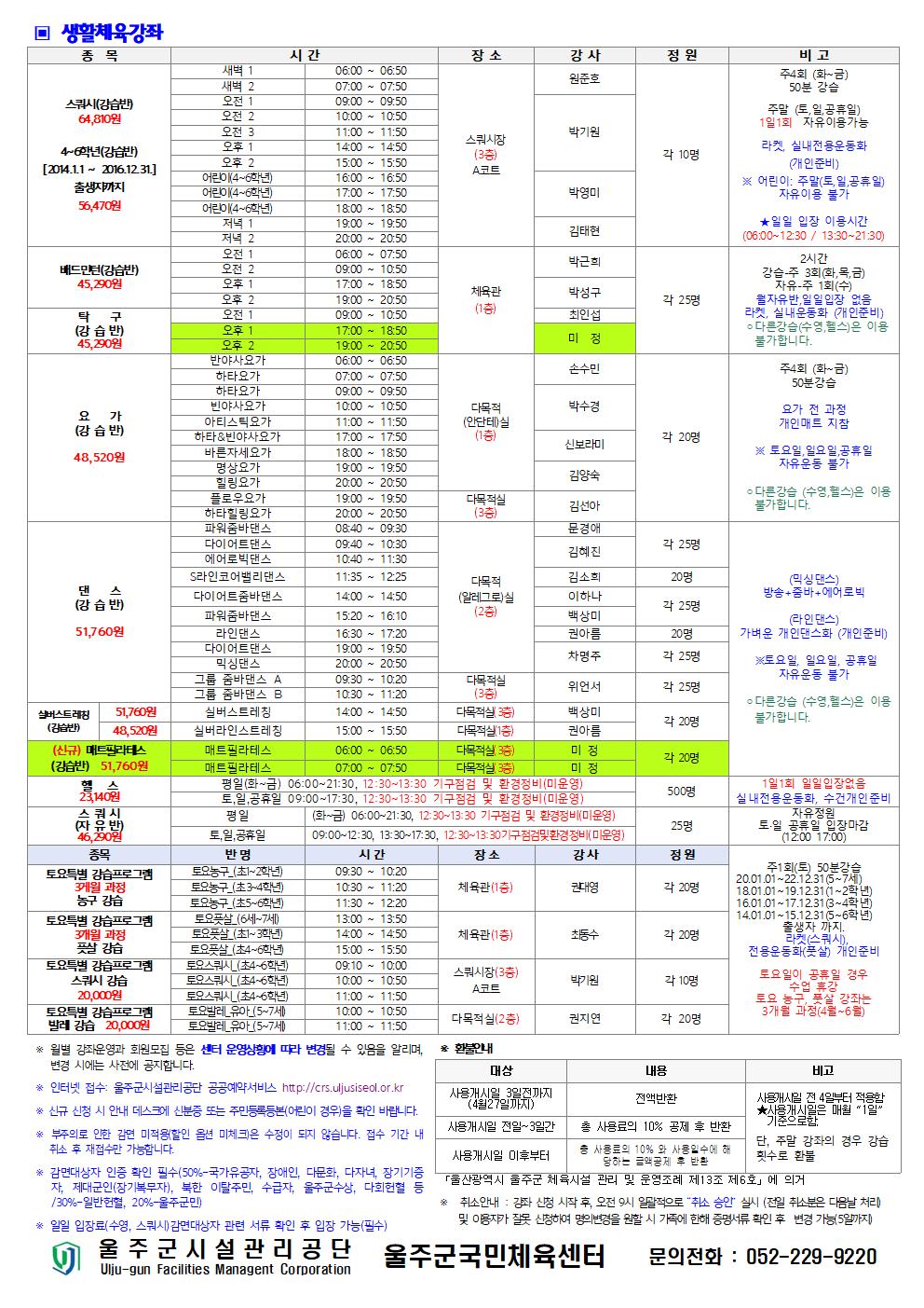 ▶생활체육: 스쿼시, 배드민턴, 탁구, 요가, 댄스(줌바포함), 실버스트레칭, 헬스, 매트필라테스(신규)